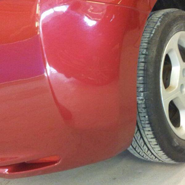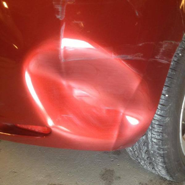 Her ser du en bulet plastskærm/stødabsorberer med ridser i lakken. Plastikken blev opvarmet og rettet ud til sin oprindelige form for derefter at blive lakeret.
